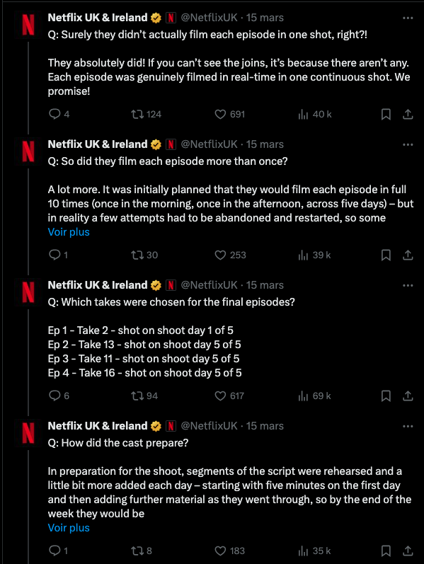La serie Adolescence, disponibile su Netflix, suscita un entusiasmo quasi senza precedenti sui social network. Ogni episodio è stato girato in un unico piano-sequenza continuo, in tempo reale. Attraverso una serie di post su X, l'account ufficiale di Netflix UK & Ireland ha svelato i segreti della realizzazione di questa produzione evento, rivelando dettagli del set e rispondendo alle domande che gli spettatori potrebbero porsi guardando la serie.